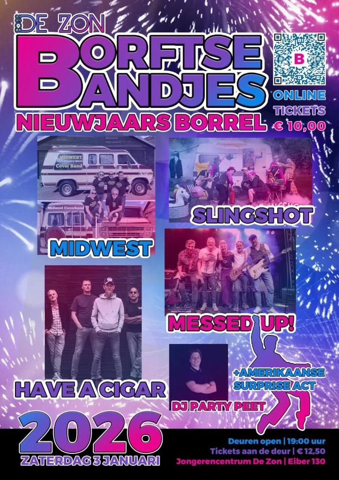 Borftse Bandjesavond Kaartje kost €10 en €12,50 aan de deur BESTEL TICKETS Datum 03 jan 2026 Tijd 19:00 - 03:00 Kosten €10,00 Locatie De Zon Eiber 130, Bodegraven
