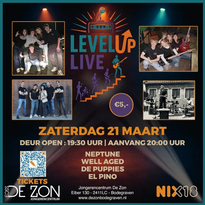 LevelUp Live BESTEL TICKETS Datum 21 mrt 2026 Tijd 19:30 - 03:00 Kosten €5,00 Locatie De Zon Eiber 130, Bodegraven